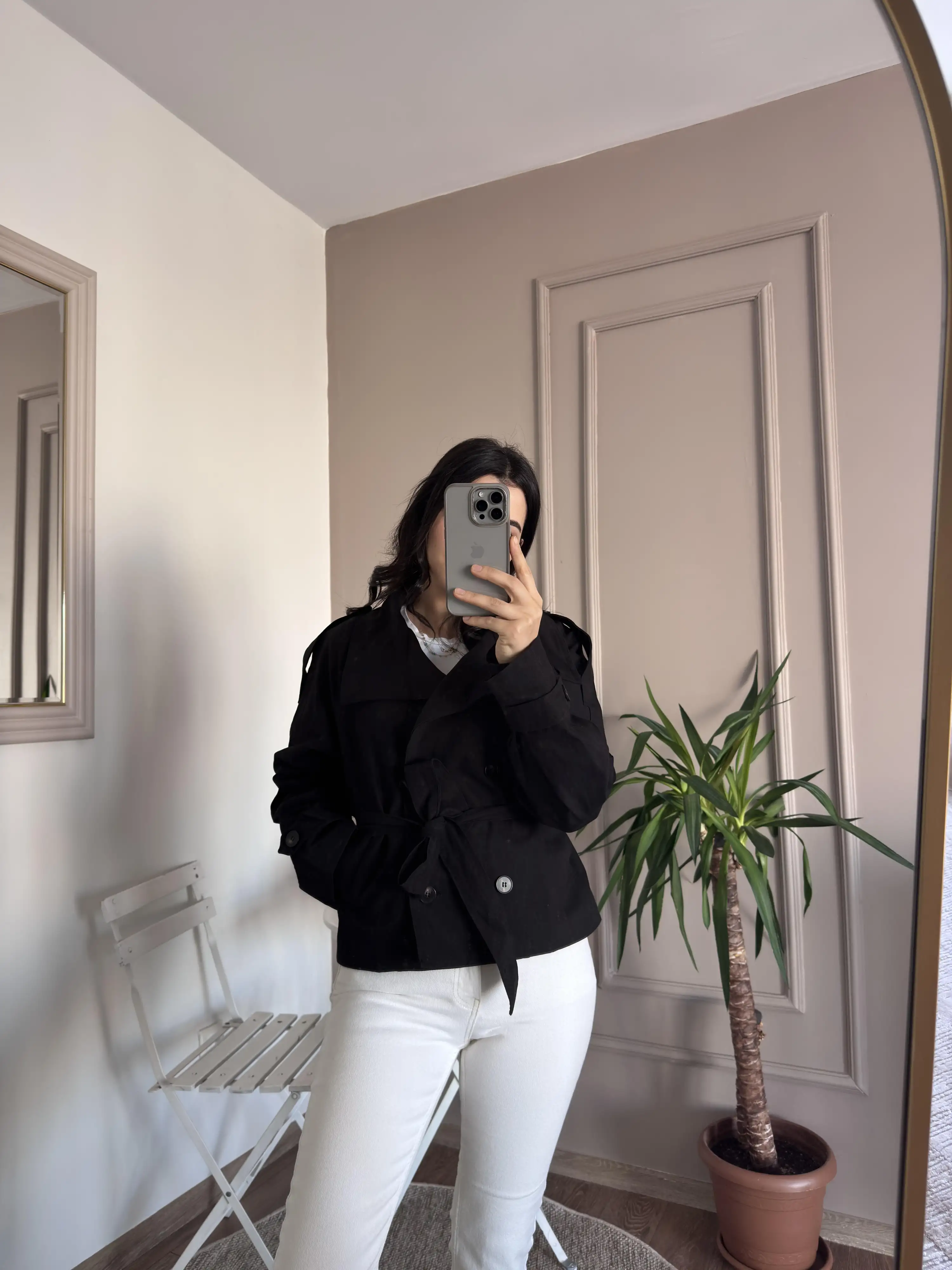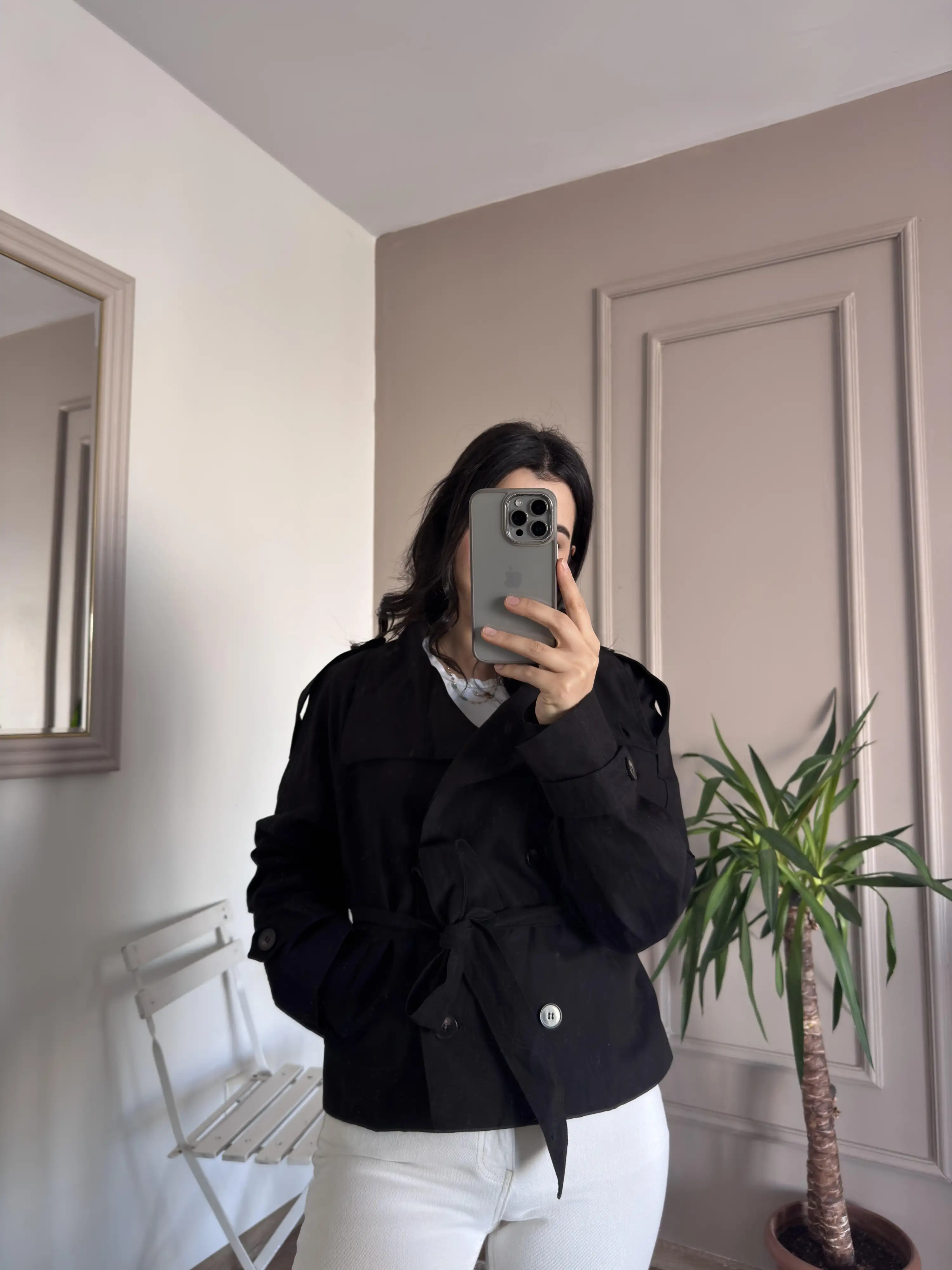 Şık ve modern tasarımıyla her kombine uyum sağlayan siyah kısa trençkot modeli