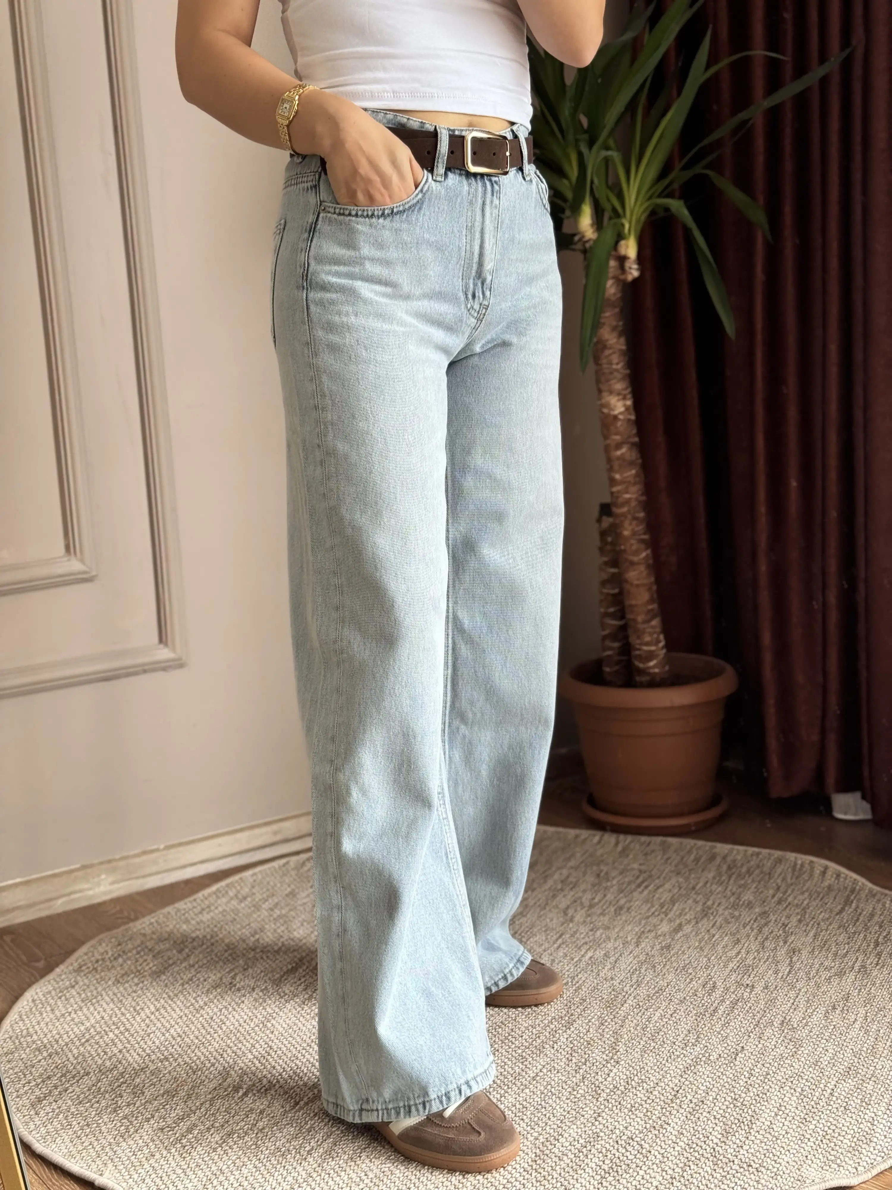 Günlük şıklık ve rahatlığı bir araya getiren yüksek bel mom buz mavisi kot jean pantolon, modern tarzın vazgeçilmez parçalarından biridir.