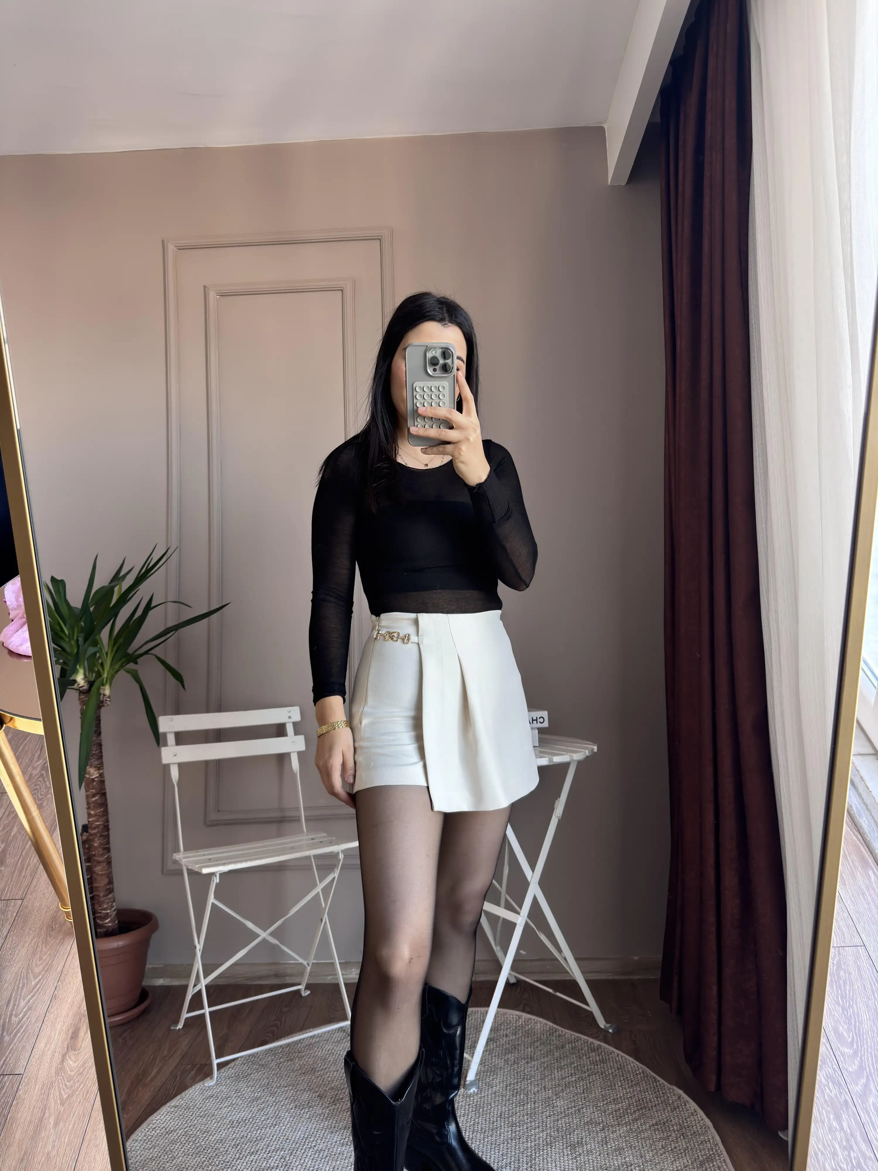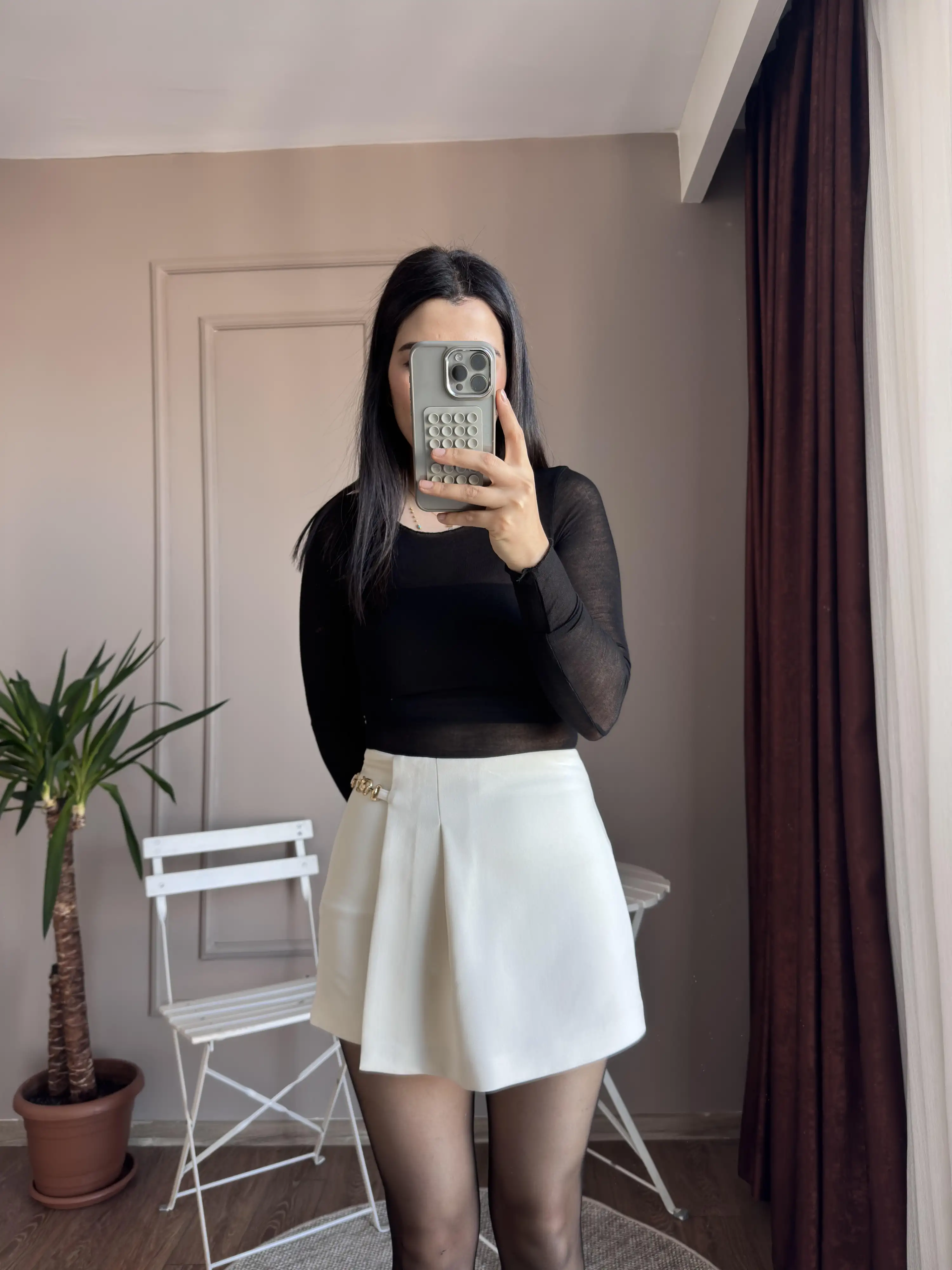 Zincir Detaylı Ekru Kumaş Şort Etek – Ürün Açıklaması